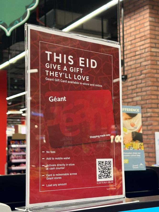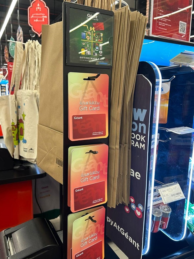 ويمكن شراء كل من البطاقات العادية والرقمية بحد أدنى للرصيد مقداره 50 درهماً، وتفعيلها في المتجر، مع إضافة النسخة الرقمية إلى محفظة الهاتف المحمول. وبإمكان المتسوقين أيضاً شراء بطاقات رقمية من الموقع الإلكتروني المخصص لبطاقات الهدايا  (geantuae.ogloba.com) وبمجرد تحميلها أو إعادة تحميلها، تكون صالحة لمدة 12 شهراً.