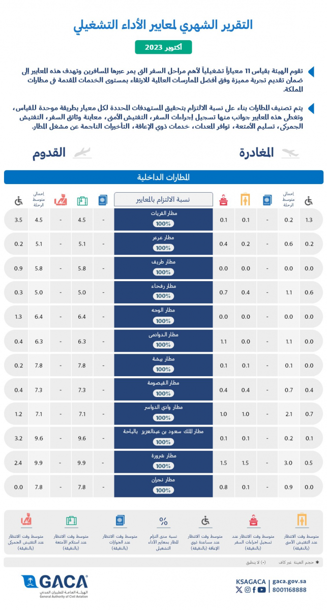 أصدرت الهيئة العامة للطيران المدني اليوم، تقريرها الشهري عن أداء مطارات المملكة الدولية والداخلية، لشهر أكتوبر 2023، وفقاً لـ 11 معياراً أساسياً لقياس الأداء.