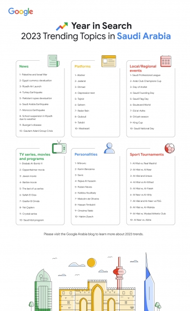 أطلقت Google اليوم قوائم المواضيع الأكثر بحثًا لعام 2023 في منطقة الشرق الأوسط وشمال أفريقيا. تكشف القوائم السنوية عن كلمات البحث التي حققت نموًا ملموسًا خلال العام مقارنةً بالعام السابق. وتضم القوائم مواضيع مختلفة مثل الأخبار، والمنصات، والفعاليات، والأفلام، والمسلسلات، والمباريات الرياضية، والشخصيات التي بحث عنها الأفراد في مختلف الدول.