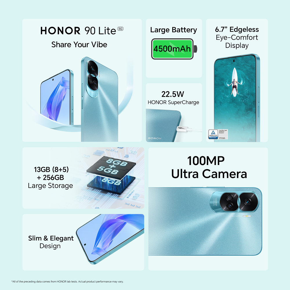 هاتف HONOR 90 Lite مُتاحاً للشراء بسعر 949 ريال سعودي، مع خدمة HONOR Care مجاناً + ضمان لدول مجلس التعاون الخليجي لمُدة 24 شهر، و14 يوم استبدال للتلف.