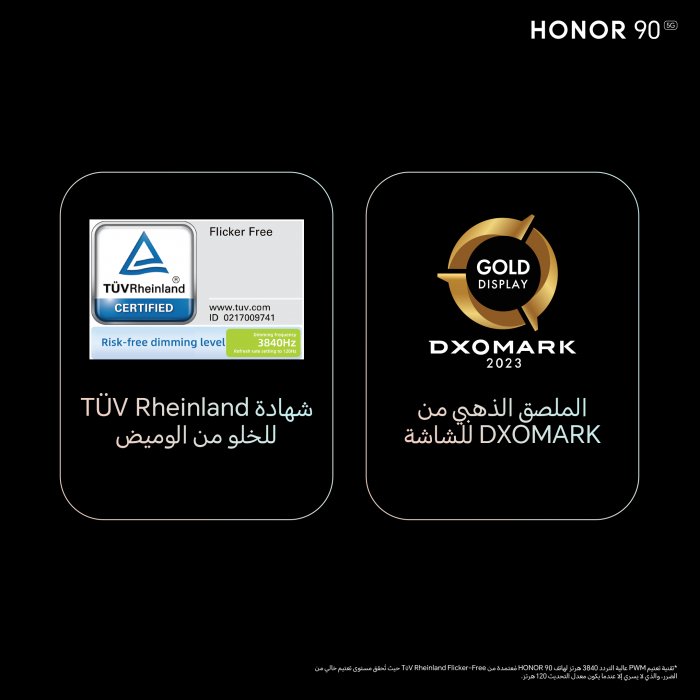 حصل HONOR 90 أيضاً على شهادة TÜV Rheinland Flicker Free وحقق مستوى التعتيم بدون أي ضرر على العين، وهو مثالي لجيل اليوم المتعطش للترفيه، وأولئك الذين يقضون ساعات طويلة في مشاهدة المحتوى على هواتفهم الذكية.