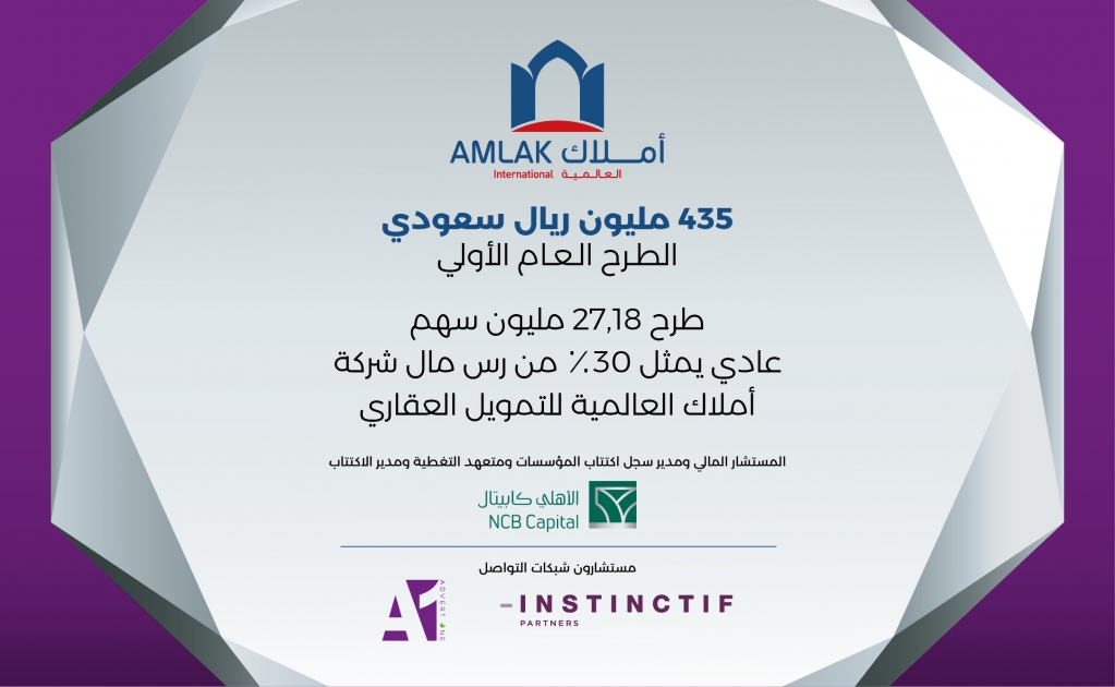 وتعد شركة أملاك العالمية واحدة من الشركات السعودية الرائدة في مجال التمويل العقاري من خارج القطاع المصرفي، وتقدم حلولا تمويلية عقارية متوافقة مع أحكام الشريعة الإسلامية للعملاء من الأفراد والشركات ورجال الأعمال ذوي الملاءة المالية. وقد عينت أملاك كلا من "أدفيرت ون" و إنستنكتيف بارتنرز" لتقديم خدمات المساندة والدعم للإدارة العليا للشركة والمستشار المالي لعملية الاكتتاب، شركة الأهلي كابيتال، في جميع المسائل المتعلقة بالاستشارات الإعلامية والإعلانية الاستراتيجية للاكتتاب، بما في ذلك استكمال الاستعدادات اللازمة لأول عرض تقديمي من خلال منصات افتراضية في المملكة.
