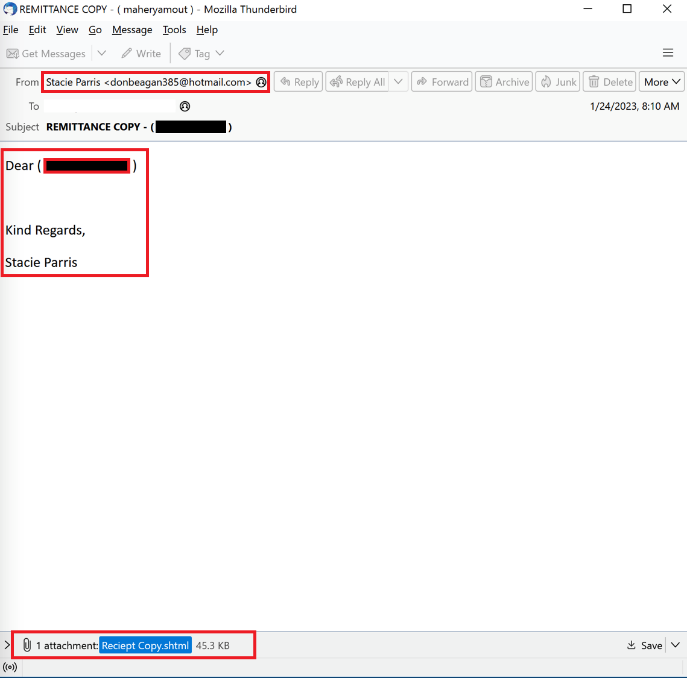 أموال مجانية: تعتمد الرسائل الاحتيالية عبر البريد الإلكتروني على استغلال سمات الجشع والفضول البشري. ويحاول المجرمون السيبرانيون إقناع الأشخاص بفتح ملف مرفق خبيث يتعلق بإيداعات الأموال. وفي الواقع، يكون هذا الملف عبارة عن صفحة HTML تعيد توجيه الضحية إلى صفحة "مايكروسوفت آوتلوك" وهمية لسرقة بيانات اعتماد البريد الإلكتروني.