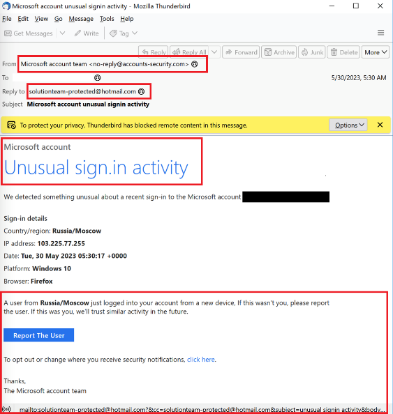 نشاط غير عادي لتسجيل الدخول إلى حساب البريد الإلكتروني: تشير هذه التنبيهات الزائفة إلى وجود نشاط تسجيل الدخول sign-in/log-in الخاطئ في حساب البريد الإلكتروني للمستخدم، وتوفير رابط للإبلاغ عن المستخدم. ويتضمن البريد الإلكتروني تفاصيل تسجيل الدخول، مثل الدولة وعنوان بروتوكول الإنترنت والتاريخ والمتصفح، ما يجعل التنبيه يبدو شرعياً ويثير القلق في نفس الشخص المتلقي. ولتزامن هذا النشاط مع موسم السفر، تزداد احتمالات نجاح الاحتيال ووصول المجرمين السيبرانيين إلى أهدافهم.