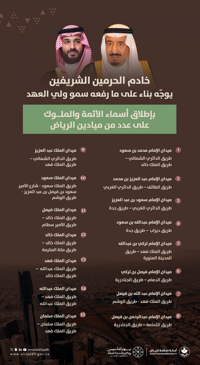 وجه خادم الحرمين الشريفين الملك سلمان بن عبدالعزيز آل سعود بإطلاق أسماء أئمة وملوك الدولة على 15 ميدانًا بمدينة الرياض، وذلك تزامنًا مع احتفاء المملكة العربية السعودية بيوم التأسيس الذي يوافق 22 فبراير من كل عام.