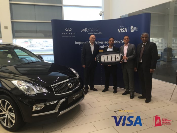 أعلنت "فيزا"، الشركة العالمية لتقنيات الدفع المدرجة في بورصة نيويورك تحت الرمز (NYSE:V) وشريك المدفوعات الرسمي لمهرجان دبي للتسوق 2017، عن فوز اثنين من سعداء الحظ حاملي بطاقات فيزا، بسيارتي "إنفينيتي كيو إكس 50" الكروس اوفر الفاخرة الرياضية متعددة الاستخدامات ضمن حملتها الترويجية "عروض تتجاوز المستحيل" في مهرجان دبي للتسوق 2017.