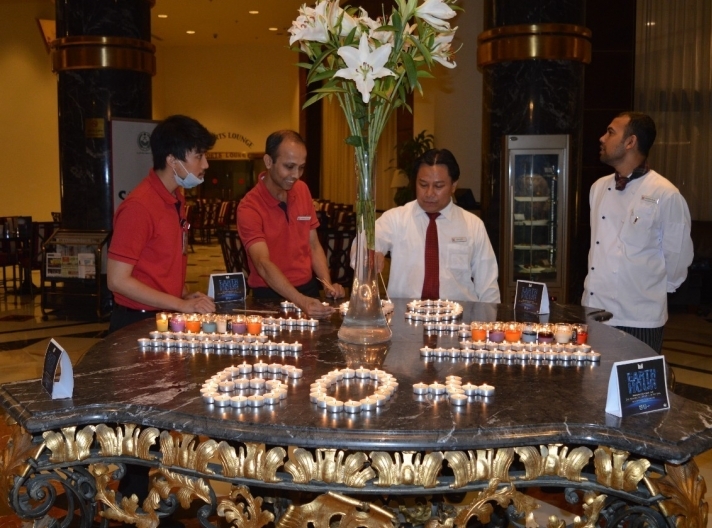 وقبل بدء ساعة الأرض بدقائق، تجمع الضيوف وفريق عمل فندق وأبراج مكة ميلينيوم في ردهة الفندق والأبراج ، حيث قام الفاتي بإطفاء الأضواء الرمزية عند الساعة 8:30  مساءً للإشارة إلى بدء الحفاظ على الطاقة لمدة 60 دقيقة، كما أطفئت الأضواء والأجهزة غير الضرورية لمدة ساعة في مرافق مختلفة من الفندق، وكذلك بادر الضيوف الموجودون في الغرف إلى إطفاء الأضواء غير الضرورية للمشاركة في الحدث . وفي المقابل أضيئت الشموع  في باحة الفندق على شكل 60+ ساعة الأرض، وهي مصنوعة من مواد مستدامة بما في ذلك شمع العسل وهي خالية من الدخان وغير سامة وغير مسببة للحساسية، وطبيعية وخالية من البترول.
