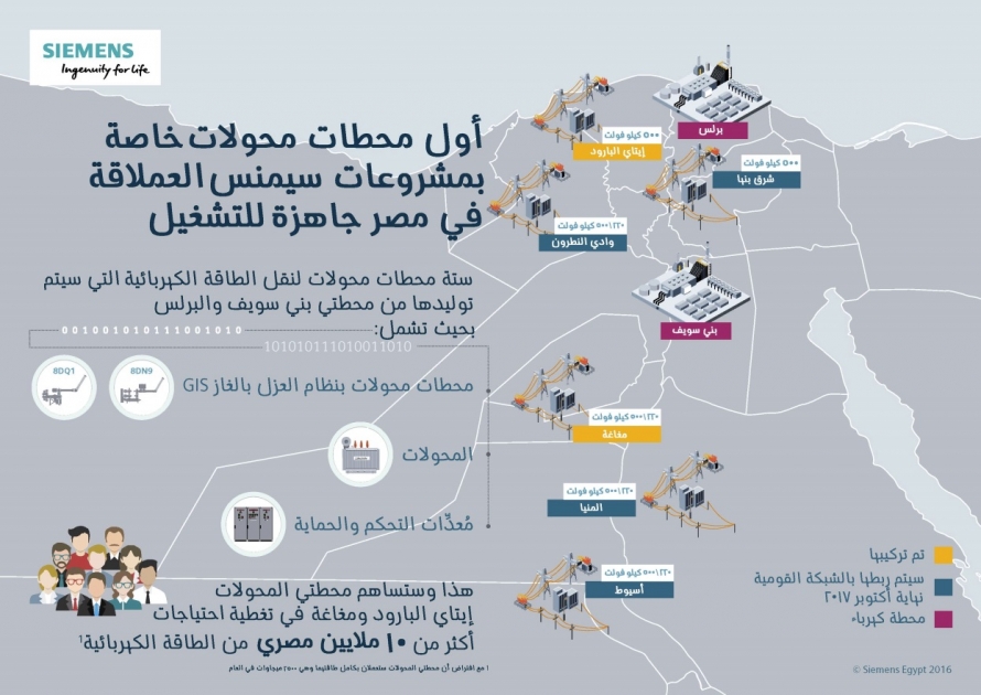 أعلنت شركة سيمنس عن نجاحها في تنفيذ أول أثنين من محطات المحولات والتي ستقوم بنقل الطاقة الكهربائية التي يتم توليدها من محطتي بني سويف والبرلس وربطها بالشبكة القومية. يُشار هنا أنه عندما يتم الانتهاء من محطات الكهرباء التي تقوم سيمنس حالياً ببنائها بالتعاون مع شركائها المحليين، ستتضمن أيضاً ستة من محطات المحولات بقدرة 220550 كيلو فولت وذلك من أجل ضمان توفير امدادات طاقة تتسم بالموثوقية والمرونة.
