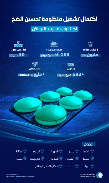 أعلنت شركة المياه الوطنية عن تحسين منظومة ضخ المياه في أحياء غرب الرياض وجنوبها بسعة تصميمية بلغت مليون متر مكعب، وبتكلفة مالية تجاوزت (683) مليون ريال لخدمة أكثر من مليون مستفيد، وذلك ضمن جهود الشركة في تقديم خدمات مياه مستدامة لعملائها.