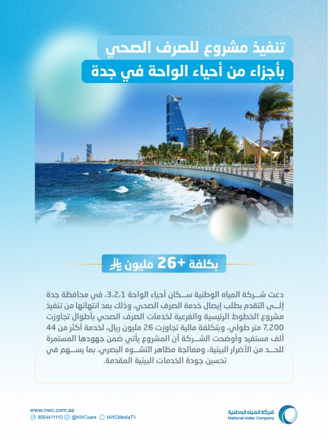 أعلنت شركة المياه الوطنية، ممثلة بالقطاع الغربي، اكتمال تنفيذ مشروع الخطوط الرئيسية والفرعية لخدمات الصرف الصحي في أحياء الواحة (1، 2، 3) بمحافظة جدة، بخطوط رئيسية وشبكات تجاوزت (7,200) متر طولي، وبتكلفة مالية تجاوزت (26) مليون ريال.