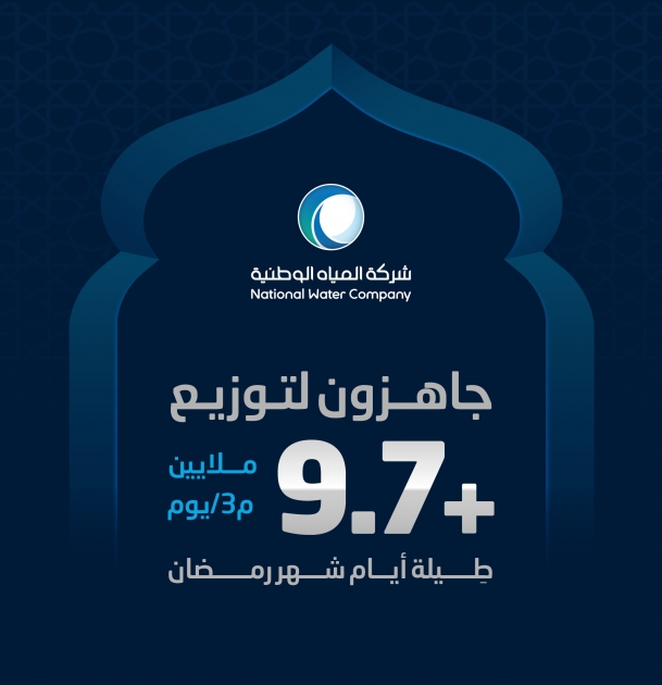 أكملت شركة المياه الوطنية استعداداتها لموسم شهر رمضان المبارك، إذ ستوزع خلال الفترة المقبلة نحو ما يزيد على (9.7) ملايين متر مكعب يوميًا في جميع مناطق المملكة ومدنها، بهدف توفير أكبر كمية من المياه لأهالي المناطق وزوارها خلال شهر رمضان الذي عادة يشهد ارتفاعًا ملموسًا في الطلب على المياه.
