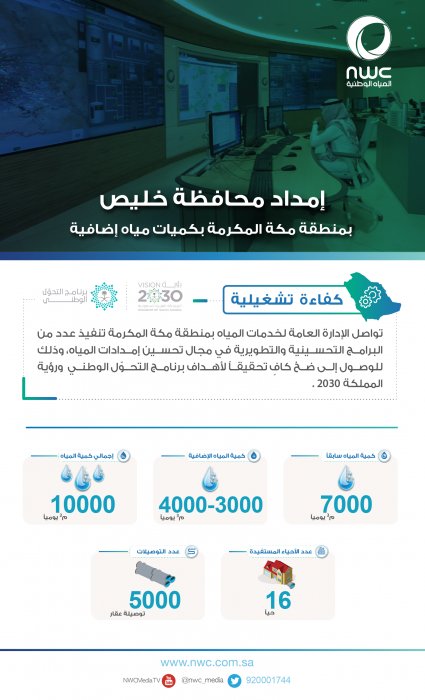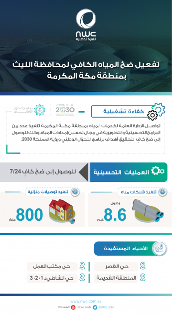 أنهت شركة المياه الوطنية ممثلة بالإدارة العامة لخدمات المياه بمنطقة مكة المكرمة، أعمال استكمال المرحلة الأولى من أعمال تمديد شبكات المياه والتوصيلات المنزلية بمحافظة الليث وتشغيلها. إضافة إلى البدء في ضخ كميات إضافية من المياه تبلغ 10 آلاف م3 لتغطية 5 آلاف توصيلة تخدم 16 حيًا عبر الشبكة إلى محافظة خليص تضاف إلى الكميات المعتادة.