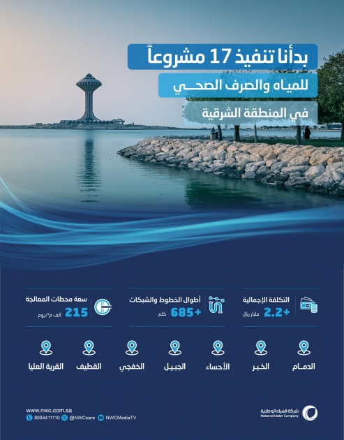 أعلنت شركة المياه الوطنية، ممثلةً بالقطاع الشرقي عن البدء في تنفيذ (17) مشروعًا حيويًا بالمنطقة، بكلفة تزيد على (2.2) مليار ريال، تستهدف مكونات في منظومة الخدمات البيئية والمائية، تضم محطات معالجة بيئية، ومحطات فرعية، وخطوط ضخ وطرد رئيسية وفرعية، واستبدال شبكات، وذلك بهدف التوسع والارتقاء بالخدمات المقدمة لسكان المنطقة في عدد من المحافظات والمدن.