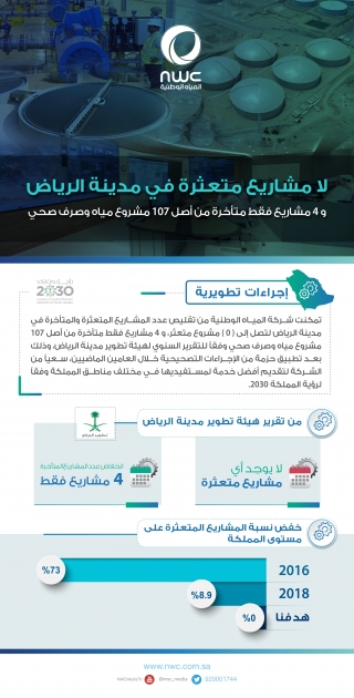 نجحت شركة المياه الوطنية في تقليص عدد المشاريع المتعثرة والمتأخرة في مدينة الرياض، وذلك بعد تطبيق حزمة من الإجراءات الاحترافية التصحيحية خلال العامين الماضيين (2017 -2018).