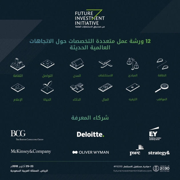 وتضم قائمة شركاء المعرفة الذين سيدعمون مبادرة مستقبل الاستثمار لهذا العام كل من: ديلويت (Deloitte.)، إرنست ويونغ ((EY، ماكنزي آند كومباني (McKinsey & Co)، أوليفر وايمان (Oliver Wyman)، بي دبليو سي / استراتيجي&(PwC/Strategy&) ومجموعة بوسطن الاستشارية (BCG)؛ حيث ستتولى كل من هذه الشركات استقطاب كبار القادة من قطاع الأعمال والحكومات إضافة إلى المجتمع المدني وذلك لإثراء النقاش وتقديم رؤى عميقة خلال ورش العمل. وتضم قائمة المواضيع التي ستتناولها ورش العمل كل من الآتي: