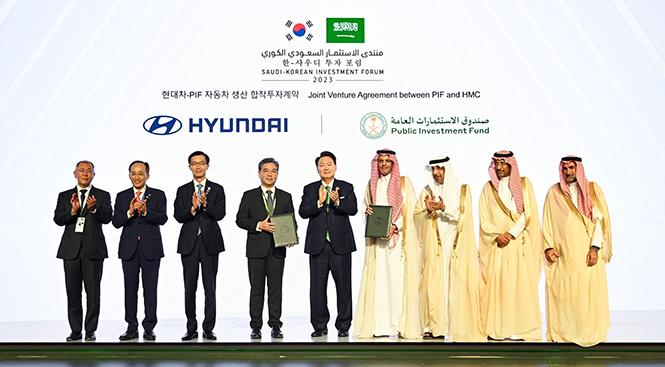 أعلن صندوق الاستثمارات العامة وشركة هيونداي موتور توقيع اتفاقية مشروع مشترك بهدف إنشاء مصنع عالي الأتمتة لتصنيع السيارات في المملكة.