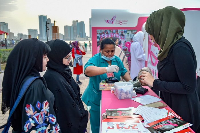 ووفرت المسيرة في يومها الأول الفحوصات الطبية المجانية للكشف عن سرطان الثدي في أربع مواقع رئيسة بإمارة الشارقة هي: صحارى سنتر، وميغا مول، ومنتزه الشارقة الوطني، وسوق الجبيل التي خصصت للرجال، إلى جانب العيادات الطبية الثابتة الموزعة على إمارات الدولة السبع، وعيادة القافلة الوردية الطبية المتنقلة، التي تواجدت في واجهة المجاز المائية، وشهدت هذه العيادات تفاعلاً وإقبالاً كبيرين من قبل المراجعين حيث استقبلت 1750 شخصاً، بينهم 166 رجلاً، و1584 سيدة، تم تحويل 460 شخصاً منهم للماموجرام، و137 للأشعة الصوتية، علماً بأن العيادات الثابتة السبع، وعدد من العيادات المتنقلة الأخرى كانت قد بدأت في استقبال المراجعين قبل يومين من انطلاق المسيرة.