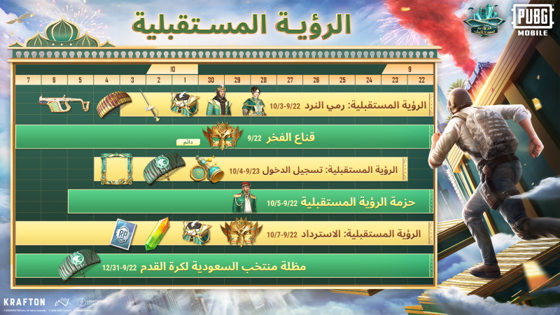 وتهدف "الرؤية المستقبلية" إلى الفخر بالماضي والأمل نحو المستقبل. ستتاح الفرصة للاعبين للمشاركة في الاحتفالات المشوقة من خلال العناصر الخاصة داخل اللعبة. وستتاح الفرصة لمستخدمي اللعبة للمشاركة من خلال العناصر الخاصة داخل اللعبة والتي تشمل مظلة مخصصة للمنتخب الوطني التي ستكون متاحة للشراء اعتبارًا من 22 سبتمبر الجاري، كما يستطيع اللاعبون أيضًا كسب مظلة مجانية لوقت محدود واستخدامها في ساحة المعركة.