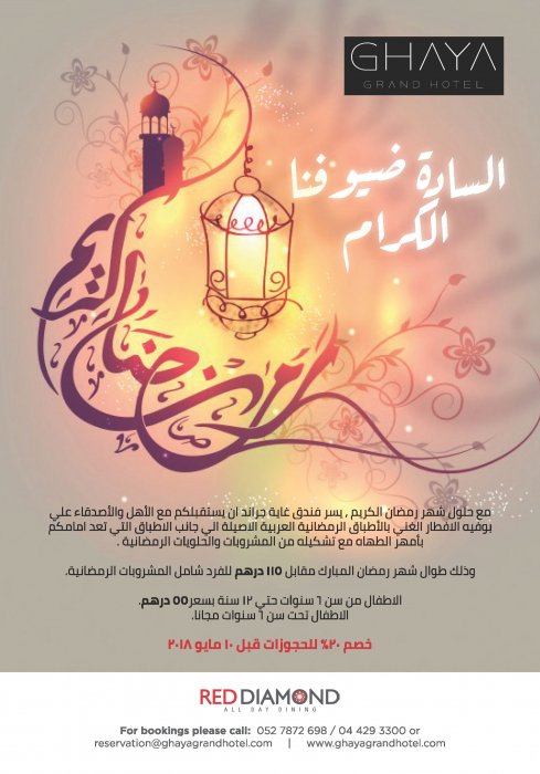الأفطالر التقليدي موجود كل يوم في شهر رمضان من الغروب حتى الثامنة و نصف في مطعم "ريد دايموند" بسعر 115 درهم للشخص و يشمل العرض أنواع المأكولات العربية. الأطفال من السن السادسة الى الثانية عشر يأكلون على مبلغ 50 درهم للطفل. الأطفال الأقل من السن السادسة يأكلون مجانا و لدينا منطقة اللعب للأطفال.
