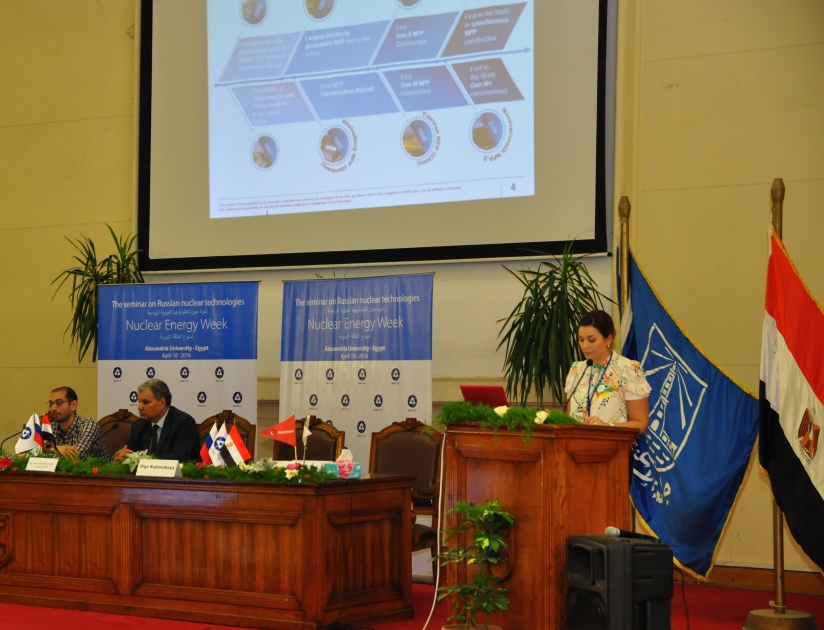 خلال الفترة من 9 إلى 11 إبريل 2016، عُقد أسبوع الطاقة النووية في جامعة الإسكندرية في مصر. وتعتبر جامعة الإسكندرية واحدة من أقدم وأعرق الجامعات في مصر. وقد أقيم أسبوع الطاقة النووية في كلية الهندسة؛ حيث يعتبر هذا الأسبوع أحد أهم الفعاليات الصناعية في مصر. وقد نظمت الفعالية هيئة المحطات النووية في مصر، وهيئة الرقابة النووية والإشعاعية، وهيئة الطاقة الذرية المصرية، وهيئة المواد النووية في مصر.