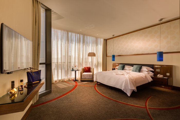 بتصميمه العصري اللافت، يضم الفندق 236 غرفة وجناحاً فاخراً موزعة على ثمانية طوابق، وتتنوع من غرف كلاسيكية إلى أجنحة ملكية، بالإضافة إلى غرف كلوب روتانا المصممة لتلبي بشكل خاص احتياجات المسافرين من رجال الأعمال.