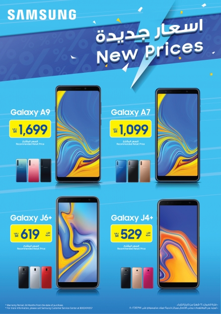 وستكون أسعار الهواتف وفقًا للأسعار الجديدة على النحو التالي:A9Galaxyقبل (1999 ريال) وأصبح (1699 ريال)، وA7 Galaxyقبل (1299 ريال) وأصبح (1099 ريال)، فيما سيكون هاتف +J6 بسعر (619 ريال) فقط بدلًا من( 729 ريال)، و+J4بمبلغ ( 529 ريال) بدلًا عن ( 599 ريال).