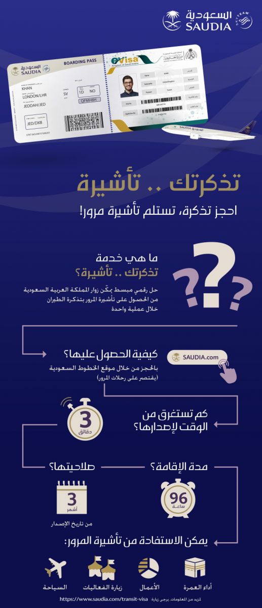 بدأت الخطوط السعودية في تقديم الخدمة الجديدة "تذكرتك تأشيرة" والتي تعتبر الأولى من نوعها على مستوى العالم، حيث ستمكن الضيوف الزوّار من الوصول للمملكة العربية السعودية عبر ربط رقمي تكاملي لتأشيرة المرور (ترانزيت) بتذكرة الطيران وإصدارها بسهولة ويُسر، ويأتي ذلك بالتعاون البنّاء مع وزارة الخارجية وعدد من الجهات الحكومية والمتمثلة في كلٍ من وزارة الداخلية، وزارة الحج والعمرة، برنامج خدمة ضيوف الرحمن، والهيئة السعودية للسياحة.