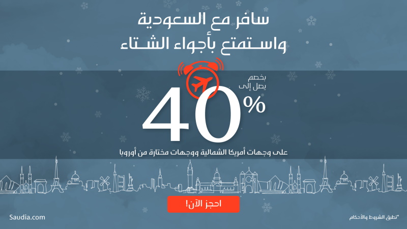 الخطوط السعودية تطلق حملة موسم الشتاء وتوفر خصماً يصل إلى (40%) لعدد من الوجهات الدولية على درجة الضيافة