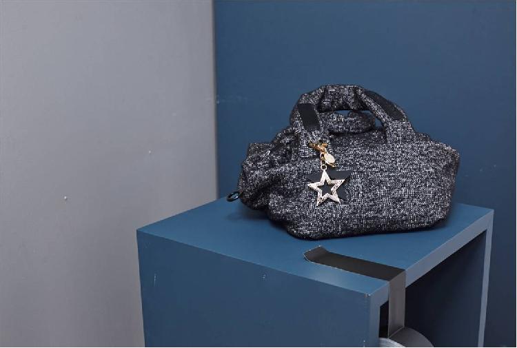 ومكسوة بصوف الغنم المدبوغ في حين تمّ تزيين الحقائب المصممة في شكل اسطواني والمصنوعة من الجلد اللين بأكسسوارات ذهبية