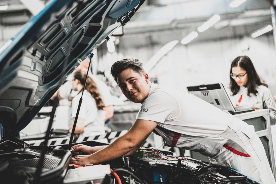 دأبت أودي على دعم الشباب من أجل بدء حياتهم المهنية في مجالات الميكانيك الإلكتروني وتقنية المعلومات والمساعدة الطبية من خلال تزويدهم بالتدريب المهني في موقعي إنغلوشتات ونيكارسولم على مدار أكثر من 70 عاماً. وتجمع أودي العلوم النظرية مع التدريب العملي من خلال توفير التدريب المهني على 18 مهنة حيوية. ويمكن لطلاب وخريجي المدارس الثانوية تقديم طلباتهم لاتباع الدورة التدريبية عبر موقع Audi Careers اعتباراً من 22 يونيو 2020. وتبدأ برامج التدريب المهني للشباب في سبتمبر 2021.