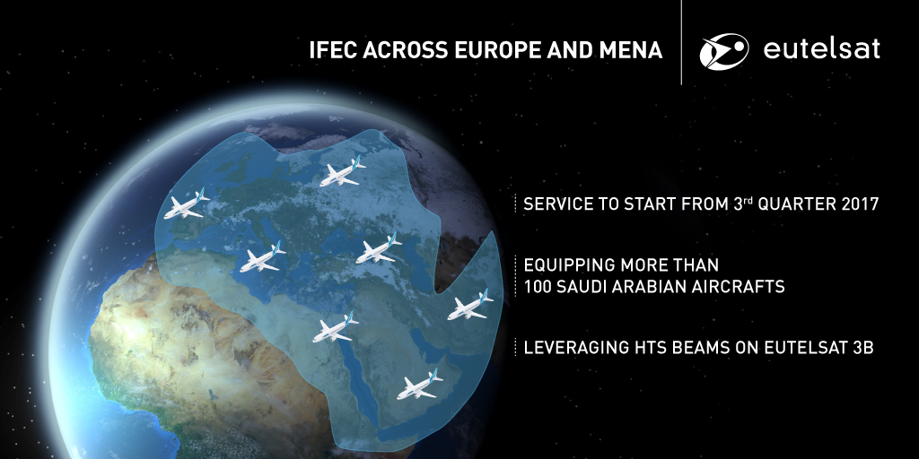 الرياض، 5 فبراير 2017– من المتوقع أن يتحول استعراض البريد الإلكتروني ومتابعة وسائل االتواصل الاجتماعي ومشاهدة بث الفيديو المباشر على ارتفاع 36 ألف قدم عن سطح الأرض إلى حقيقة واقعة بحلول نهاية العام الجاري للمسافرين على متن الطائرات الذين يستفيدون من خدمات الإتصال الفضائي الذي تزوده شركة «تقنية الفضائية»، حيث أعلن اليوم عن ابرام اتفاقية بين شركة «تقنية الفضائية»، والمملوكة بالكامل لصندوق الاستثمارات العامة في المملكة العربية السعودية وشركة «يوتلسات كوميونيكيشنز» (رمزها في بورصة نيويورك يورونكست باريس:ETL)، وهي إحدى الشركات الرائدة في العالم في مجال تشغيل الأقمار الاصطناعية. وتوفر هذه الإتفاقية والتي تقدر بملايين الدولارات وتمتد لعدة أعوام حزمة مركزة على القمر الاصطناعي «يوتلسات 3 بي» (E3B) لتقديم تقنية اتصالات النطاق الفضائي العريض (HTS) لعملاء «تقنية الفضائية» من شركات الطيران في منطقة الشرق الأوسط وشمال إفريقيا والبحر المتوسط وأوروبا. وستكون الخطوط الجوية العربية السعودية، أول شركة طيران تجارية تصل أسطولها تقنية اتصالات النطاق الفضائي العريض  لجميع طائراتها متوسطة وطويلة المدى.