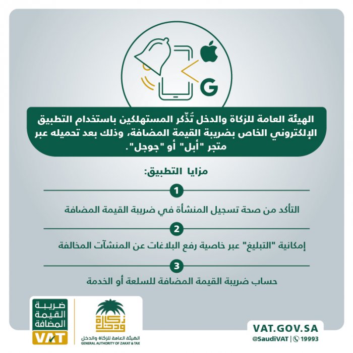 وأضافت الهيئة العامة للزكاة والدخل أن التطبيق الإلكتروني الذي يمكن تحميله على أجهزة الهواتف الذكية عبر متجر "أبل" أو "جوجل" يوفر أيضاً خدمة "الحاسبة" والتي تقوم باحتساب ضريبة القيمة المضافة للسلعة أو الخدمة المشتراة بشكل صحيح، كما يتيح للمستهلكين خدمة "التبليغ" عبر خاصية رفع البلاغات عن المنشآت المخالفة.