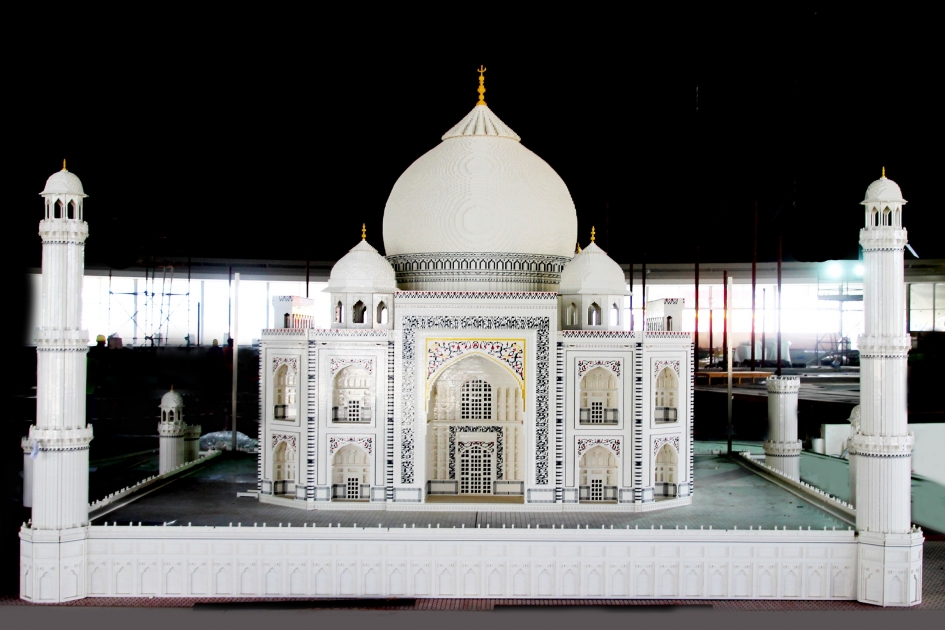 وفي الوقت الذي استغرق فيه بناء تاج محل عشرون عاماً في العالم الحقيقي، قامت "ليجولاند دبي" بتكريم هذا الإرث الأصيل وبنائه من قطع مكعبات الليجو البيضاء بلمسات من الذهب الأصفر بالإضافة إلى المكعبات الحمراء والسوداء في 2019 ساعة عمل، ويتكون هذا المجسم المذهل من 280,741 قطعة من مكعبات الليجو ويبلغ وزنه 280 طن.