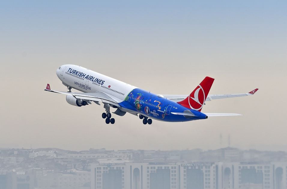 احتفالاً ببطولة كأس الأمم الأوروبية "يورو 2016" هذا الصيف، كشفت الخطوط الجوية التركية عن طائرة الركاب طراز إيرباص "A330-300" المزينة بشعار البطولة. وقامت الطائرة برحلتها الأولى إلى باريس، حيث يقام نهائي البطولة هذا العام في 10 يوليو المقبل. كما تعد الطائرة أحد مكونات الحملة الترويجية للخطوط الجوية التركية لحفز وتنشيط المشجعين قبل بطولة هذا العام.