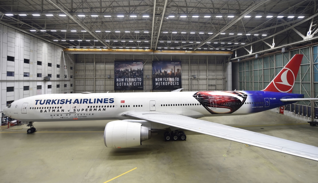 وكانت الناقلة قد قامت بتزيين إحدى طائراتها من طراز "بوينج 777" برسومات عن الفيلم الشهير "باتمان ضد سوبرمان: فجر العدالة". وكانت الفكرة تزعم أن الخطوط الجوية التركية تسافر إلى المدينتين الخياليتين في الفيلم جوثام سيتي ومتروبوليس. وبعيداً عن الشاشة، كانت الخطوط الجوية التركية ملتزمة بالكشف عن تجارب مبتكرة مستوحاة من الفيلم تعطي الجمهور حول العالم نظرة داخلية لعالم البطلين الخارقين الشهيرين، بما فيها إمكانية قيام المسافرين بحجز رحلات إلى محطتي الناقلة الإضافيتين "الجديدتين" ضمن شبكة خطوطها.