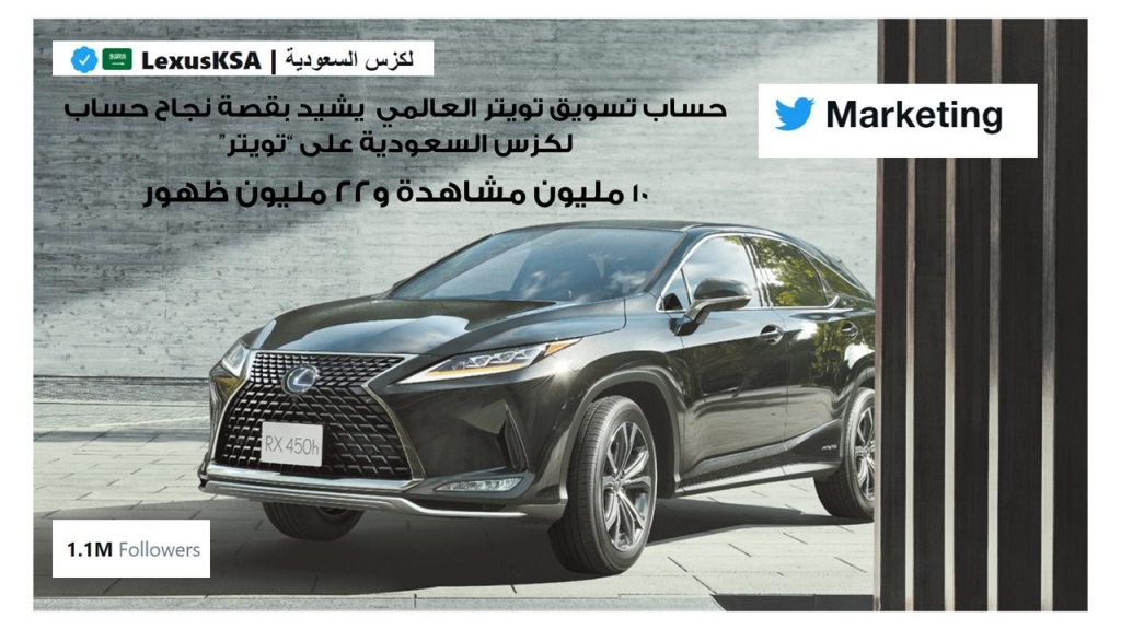 حيث استطاعت لكزس السعودية عبر حسابها على تويترLexusKSA أن تحقق 10 مليون مشاهدة و22 مليون ظهور، وذلك للفيديو الذي نشرته في شهر رمضان المبارك تحت عنوان "الجمعات العائلية في رمضان لها طعم ثاني" #رمضان_يحلي_جمعاتنا.