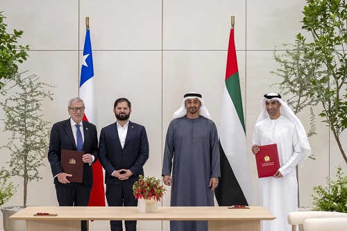 شهد صاحب السمو الشيخ محمد بن زايد آل نهيان رئيس الدولة "حفظه الله"، وفخامة غابرييل بوريك فونت رئيس جمهورية تشيلي، اليوم، مراسم توقيع "اتفاقية الشراكة الاقتصادية الشاملة " بين دولة الإمارات وتشيلي، وذلك في إطار الزيارة الرسمية التي يقوم بها رئيس تشيلي إلى الدولة.