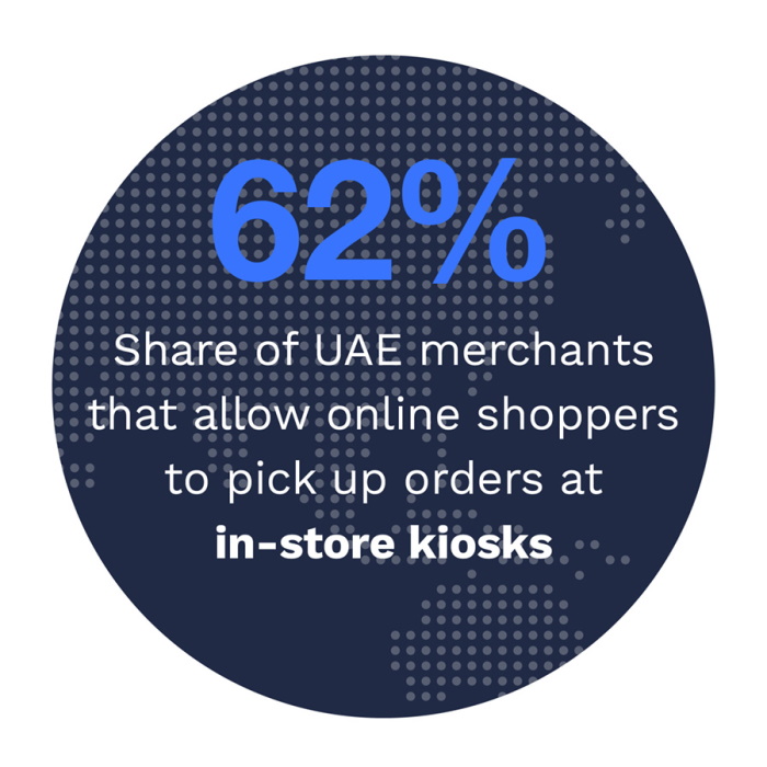 ● 62% من التجار في دولة الإمارات العربية المتحدة يتيحون للمتسوقين عبر الإنترنت إمكانية استلام الطلبات من كشك داخل المتجر.