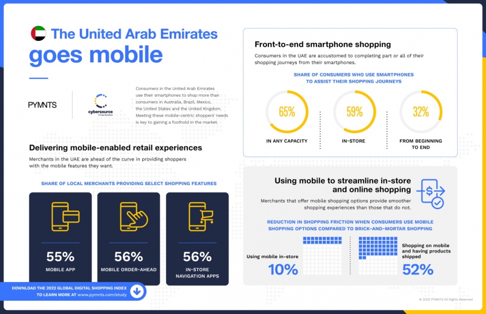 قال 72% من المتسوقين في المتاجر في دولة الإمارات العربية المتحدة بأن احتمالية استخدامهم للهواتف الذكية لتساعدهم في التسوق هي أعلى من غيرهم لا سيما في البحث عن معلومات المنتجات ومقارنة أسعارها مع التجار الآخرين، وذلك وفقاً لـ "مؤشر التسوق العالمي لعام 2022: إصدار الإمارات العربية المتحدة"، وهو استطلاع أجرته كل من PYMNTS، وCyberSource، وهي بوابة الدفع ومنصة تقييم المخاطر السيبرانية التابعة لـ Visa.