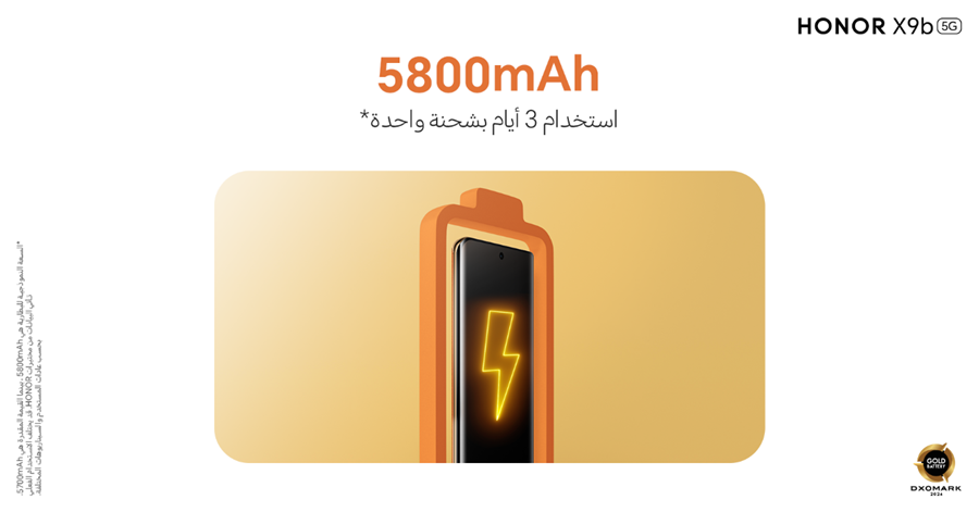 يأتي هاتف HONOR X9b 5G مزوداً ببطارية ضخمة بسعة 5800 مللي أمبير، وبالتالي الاستمتاع بتجربة استخدام الهاتف لوقت أطول دون القلق بشأن نفاذ الشحن، حيث يمكن استخدام الهاتف ما يصل إلى ثلاثة أيام لأغراض الاتصال واللعب والترفيه ضمن معايير الاستخدام القياسي. كما أن في شحنة واحدة، يمكن للمستخدمين الاستمتاع بتجربة استخدام تصل إلى 19 ساعة من تشغيل الفيديو، أو 12 ساعة من ألعاب الفيديو، أو 22 ساعة من تصفح منصات التواصل الاجتماعي.