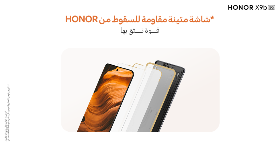 يمتاز جهاز HONOR X9b 5G، بمتانته وقدرته العالية على التحمل ومقاومته للكسر، إذ يعمل الجهاز بتكنولوجيا الشاشة المتينة المقاومة للسقوط من HONOR، والتي تضمن مقاومة الشاشة للكسر من جميع جهاتها ومن مختلف الزوايا، إذ تستخدم HONOR مواد خاصة في التصنيع تساعد في امتصاص تأثير سقوط الجهاز من ارتفاع 1.5 متر، مع خاصية الحماية المتكاملة 360 درجة، لحماية الجهاز من جميع الزوايا، حتى في حال سقوطه على سطح رخامي.