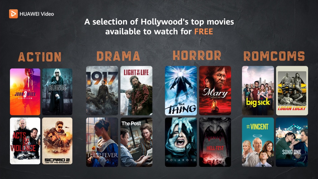 إن لدى HUAWEI Video دائماً مساحة للمحتوى الدرامي، حيث يقدم لك بعضاً من أحدث إصدارت الأفلام الدرامية، بما في ذلك فيلم "1917" الحائز على جائزة الأوسكار والذي تدور أحداثه حول الحرب العالمية الأولى، وفيلم "حمى التوليب" (Tulip Fever) الذي يدور حول دراما تعود إلى القرن السابع عشر، وفيلم "ضوء حياتي" (Light of My Life) من بطولة كريس برات. وبإمكان عشاق الدراما التاريخية الأمريكية مشاهدة فيلم "ذا بوست" (The Post)، وهي قصة مستوحاة من صحيفة واشنطن بوست يلعب دور البطولة فيها توم هانكس وميريل ستريب.