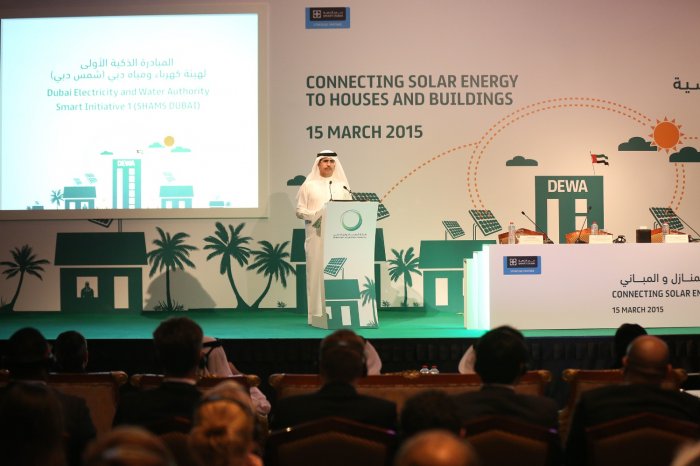 Press Release HE Saeed Mohammed Al Tayer, MD & CEO of Dubai Electricity and Water Authority (DEWA) has announced today in a press conference held at Grand Hyatt hotel in Dubai, the start of DEWA’s first smart initiative, Shams Dubai, to regulate the generation of solar energy in buildings and their connection to DEWA’s grid. The move supports the Smart Dubai initiative and the vision of HH Sheikh Mohammed bin Rashid Al Maktoum, Vice President and Prime Minister of the UAE and Ruler of Dubai to transform Dubai into the smartest city in the world in three years through 100 initiatives and 1,000 smart services that enhance the quality of life in the Emirate and achieve its sustainable development. The press conference was attended by HE Ahmed Bin Byat, Member of the Higher Committee to transform Dubai into a Smart City, Chairman of the Executive Committee of the Smart Dubai initiative, Dr. Aisha Bin Bishr, Assistant Director-General of the Executive Office, Member of the Smart Dubai Executive Committee and Team Leader of the Smart City Taskforce, HE Ahmed Buti Al Muhairbi, Secretary General of the Dubai Supreme Council of Energy, Abdul Aziz Abdulla Al Midfa, Chairman of the Middle East Solar Industry Association, senior officials from the Dubai Supreme Council of Energy, DEWA’s Executive Vice Presidents, Vice Presidents, corporate representatives and members of the press. Shams Dubai encourages tenants and building owners to install photovoltaic solar panels to generate electricity. DEWA will connect the system to its network. The electricity will be used onsite and the surplus is exported to DEWA’s grid. This encourages the use of renewable energy, increases its share in electricity production and diversifies the energy mix. “To support the Smart Dubai initiative, launched by His Highness Sheikh Mohammed bin Rashid Al Maktoum, Vice President and Prime Minister of the UAE and Ruler of Dubai, to make Dubai the smartest city on earth, and make life easier through the efficient, integrated, seamless and sustainable use of resources, we today have begun the implementation phase of the first smart initiative, Shams Dubai. This is one of three initiatives we launched last year to significantly improve the services provided to partners and customers, and make Dubai the smartest city in the world during the next three years. This will enable the city’s facilities and services to be managed using smart and connected systems that enhance living standards for all of Dubai’s residents and visitors,” said Al Tayer. “Shams Dubai supports the Green Economy for Sustainable Development economic initiative launched by His Highness Sheikh Mohammed bin Rashid Al Maktoum, and implements Council Resolution Number 46 of 2014, issued by His Highness Sheikh Hamdan bin Mohammed bin Rashid Al Maktoum, Crown Prince of Dubai and Chairman of the Dubai Executive Council, to enable customers to install photovoltaic panels to generate electricity from solar power in buildings, and connect them to DEWA’s grid. This smart initiative also supports the Dubai Plan 2021 and the Dubai Integrated Energy Strategy 2030, to develop sustainable energy projects in Dubai, by increasing the targets for renewable energy in the Emirate’s energy mix to 7% by 2020 and 15% by 2030. DEWA supports the vision of our wise leadership, which outlines the roadmap for our work and initiatives to enhance the competitiveness of the UAE and Dubai. We are fully-prepared to effectively and positively contribute to building Smart Dubai and add to the happiness of citizens and residents,” he added. “Last week, we announced the first project under the first smart initiative, in collaboration with Dubai Airports, to supply Dubai World Central - Al Maktoum International Airport in Jebel Ali with solar energy. The first step in implementing the initiative was installing photovoltaic panels to produce 30kW of electricity there. Council resolution number 46 encourages the use of renewable energy and increases its share in power generation. This will in turn diversify Dubai’s energy mix. It is a step forward on the road to sustainability. The resolution is an advance in establishing a culture of sustainability by encouraging customers to produce clean power and connect it to DEWA’s grid. Customers can use the electricity they generate using photovoltaic panels. An offset between exported and imported electricity units is conducted and the customer account is settled based on this offset,” added Al Tayer. “Our aim is to transform Dubai into the smartest city in the world and make society happier by providing smart, instant, and seamless services around the clock. Dubai has all the capabilities to reach pole position internationally, through creative and technological innovation, which is one of the fundamental enablers to ensure a stimulating, creative, and sustainable environment. We are confident that Shams Dubai will regulate the generation of solar energy in buildings and their connection to DEWA’s grid. It should positively benefit Dubai and has the full support of government and private organisations. This also applies to DEWA’s second initiative to install smart meters and networks that contribute to fast-service connection, fast response, and rationalise energy use, and also to our third initiative to establish the infrastructure to build 100 electric vehicle charging stations, which we call Green Charger, this year,” concluded Al Tayer. “This initiative launched by DEWA, the strategic partners of Smart Dubai initiative, brings us one step closer towards achieving the leading initiative launched by His Highness Sheikh Mohammed bin Rashid Al Maktoum, Vice President and Prime Minister of the UAE and Ruler of Dubai to make Dubai the smartest city in the world. We are determined to achieve this goal through a number of smart initiatives and programmes, in the near future, in collaboration with our strategic partners in 