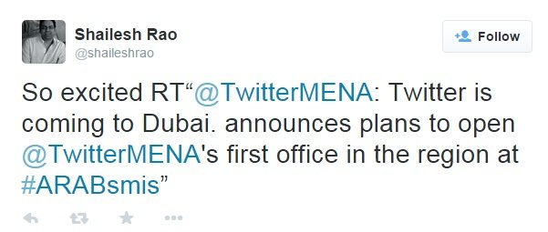 “Our vision is to make Twitter relevant for everyone, everywhere. Seventy-seven per cent of our monthly active users are outside the US. Our expansion and decision to set up office in Dubai is a natural step in being closer to our customers and partners, and provides a great opportunity for us to continue our growth,” said Rao.
