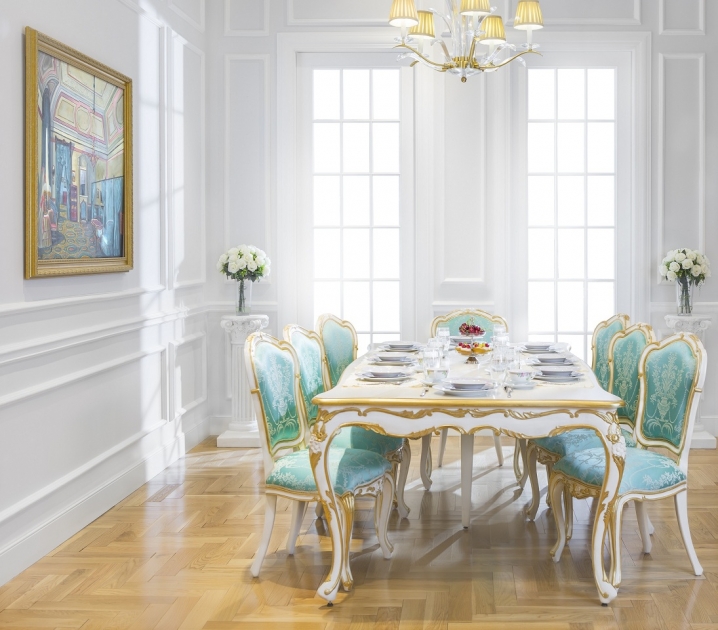 Designed to dine and relax in luxury, the Cara dining chair in the collection features a stunning appearance. With aqua blue fabric upholstery and ultra-plush- poly silk tufted to seat and back, and the slim French style cabriole legs in birch wood with bright white finish, makes it perfect for formal or casual dining. This splendid dining table is available for AED 9,450, and Cara dining arm chair for AED 2,195.