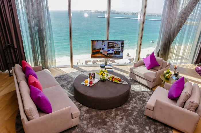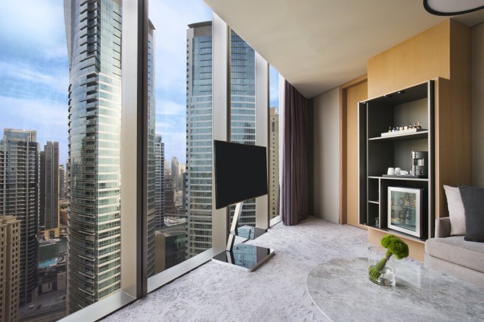 Once we entered the reception, the warm welcome astounded us. As you look around you are nothing but amazed by the beautiful architecture and interior design of the hotel. The diamond-shaped building was inspired by bright crystals and enjoyed a modern and luxuriousdesign. We were accompanied to our suite on the 14thfloor and as we entered the main surprise immediatelyimpressed us; a stunning view of “the Eye of Dubai”, which is the largest rotating wheel in the world.