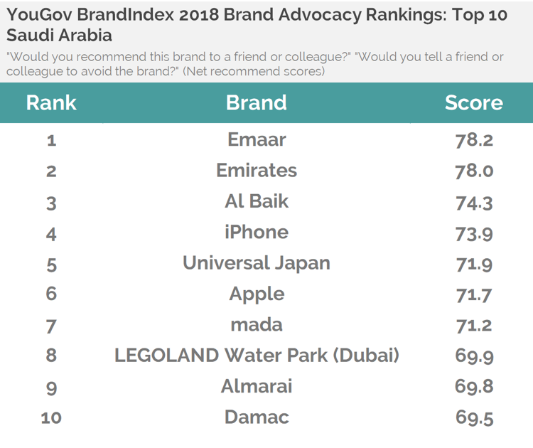 After Emirates, Emaar and Almarai are the most endorsed brands by consumers in the UAE, at number two and three, respectively. In Saudi Arabia, Emaar raced up to the top spot from number five last year, and is now closely followed by Emirates and then Al Baik. However, in Egypt, iPhone remains unchallenged at the top of the rankings, proving to be the worthiest of customer advocacy in the country. Netflix makes an impressive entry into the rankings at number two and Google has moved up to the third spot this year from number four last year.
