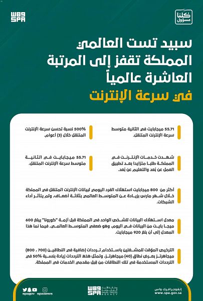 The Kingdom of Saudi Arabia jumped to the 10th position globally in internet speed, as it managed during the month of April to increase the average mobile internet speed to 55.71 MB per second, according to a report published by the international website Speed Test specialized in measuring mobile internet speeds.