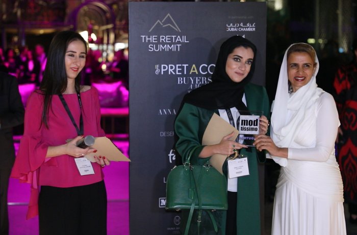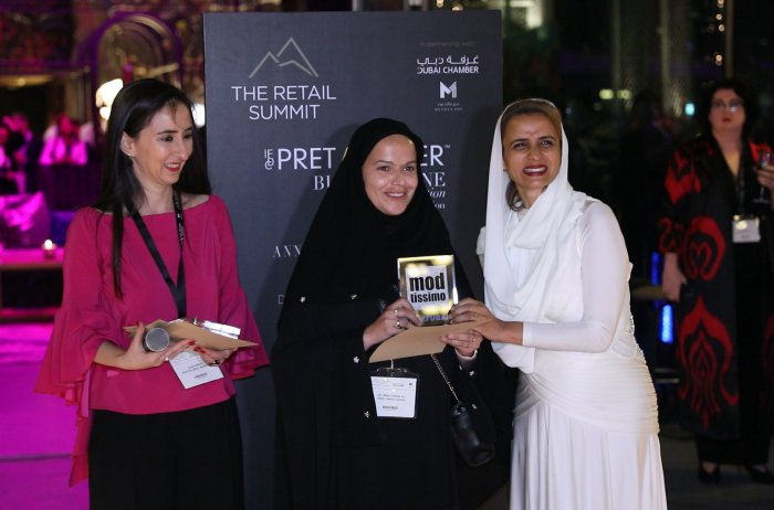 Elsa Dionisio of Modtissimo said the selection of designers was outstanding at this year,'s Pret A Cover Buyers Lane, The Retail Summit Edition. Shortlisting down to the winners was a most difficult task for her and her team based in Portugal. In this photo, Elsa is with one of the IFDC Awards winners, Hessa Al Shafar (middle) and IFDC Chairwoman, Alia Khan (right) dressed in LAMACE