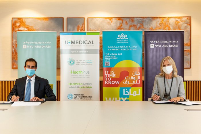 Today, NYU Abu Dhabi (NYUAD) signed a Memorandum of Understanding (MoU) with United Eastern Medical Services (UEMedical) in Abu Dhabi, the parent organization of Danat Al Emarat Hospital for Women & Children, HealthPlus Network of Specialty Centers, and Moorfields Eye Hospital Abu Dhabi. A major outcome of the MoU is establishing the HealthPlus Diabetes & Endocrinology Center in Abu Dhabi as one of the main clinic sites for the UAE Healthy Future Study (UAEHFS) set to accept participants from November 1, 2020.
